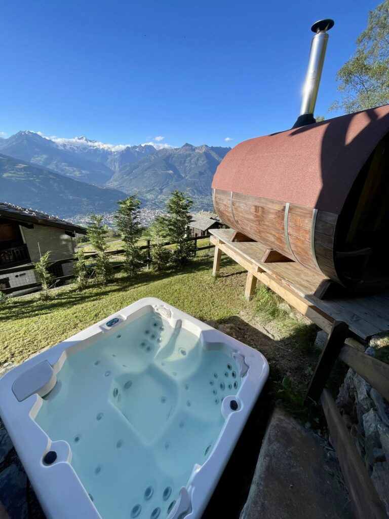 The garden is fenced and features a terrace on the left side of the house with a large wooden outdoor table and benches and is in the sun all afternoon. On the right side of the house is the sauna, wood fired and offers a fantastic view of the valley. The jacuzzi can be used at an additional cost of 150 euros per week from May through September. At the front of the house, on the height of the living room, is a balcony with a lounge sofa and chairs. A perfect spot to enjoy the view and the sun until it sets behind the Mont Blanc massif.