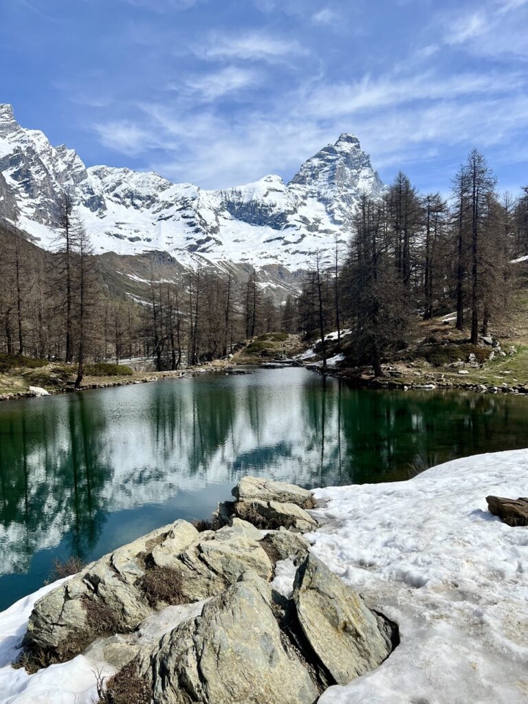Lago Blu (meest gefotografeerde meer met de Monte Cervino op de achtergrond). Het is handig om dit meer te bekijken als je op weg gaat naar Breuil-Cervinia om de Monte Cervino te bezoeken.